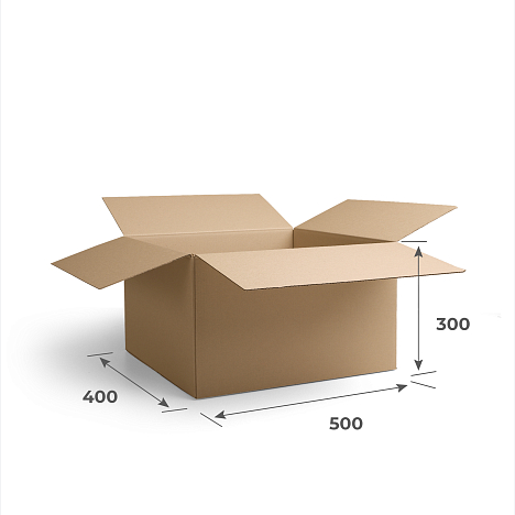 Гофрокороб 4-х клапанный 500x400x300 бурого цвета выполнен из прочного трехслойного гофрокартона марки Т-23. Короб имеет надежную конструкцию типа FEFCO 0201 и выдерживает вес до 15 кг.
