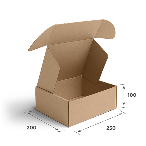 Гофрокороб 250х200х100 изготовлен из микрогофрокартона марки Т-11. Конструкция FEFCO 0427 очень простая не требует клея, скотча или каких-либо других дополнительных материалов. Заготовки для таких упаковок делаются при помощи штанцформ. Самосборный короб имеет одно явное отличия от коробок других конфигураций - клапана с язычками, благодаря которым он держит форму и не открывается. Такие тары перевозят в разобранном виде и собирают на месте упаковки товаров.