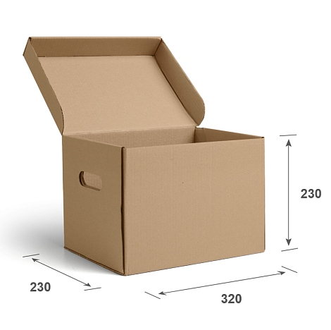 Гофрокороб архивный 320x230x230 с откидной крышкой изготовлен из прочного трехслойного гофрокартона марки Т-23 бурого цвета. Существует большоичве количество разнообразных размеров архивных коробок (конструкция FEFCO 0471), которые предназначены для упаковки документов. Например, бокс 320x230x230 очень удобно использовать для сортировки и упаковки папок размера А4. При необходимости, на него можно нанести одноцветную печать или логотип компании. Такой короб выдерживает до 25 кг.