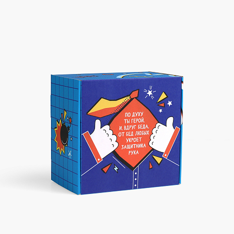 Конструкция коробки — стандартная самосборная FEFCO 0427. Подарок в такой упаковке можно подарить молодому человеку, который увлечен супергеройской тематикой и любит яркие вещи. Шкатулка сразу цепляет надписью: «По духу ты герой, и, вдруг, беда. От бед любых укроет защитника рука».