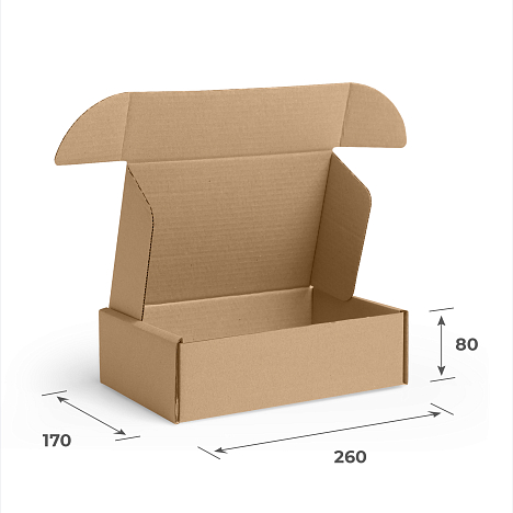 Гофрокороб почтовый самосборный S - 260x170x80 изготовлен из трехслойного гофрокартона бурого цвета марки Т-23 профиль B.