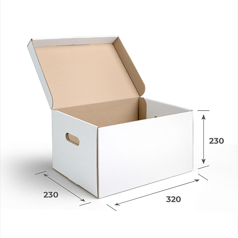 Гофрокороб архивный 320x230x230 с откидной крышкой изготовлен из прочного трехслойного гофрокартона марки Т-24 белого цвета. Существует большое количество разнообразных размеров архивных коробок (конструкция FEFCO 0470), которые предназначены для упаковки документов. Например, бокс 320x230x230 очень удобно использовать для сортировки и упаковки папок размера А4. При необходимости, на него можно нанести одноцветную печать или логотип компании. Такой короб выдерживает до 25 кг.