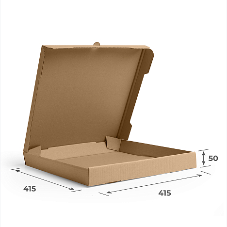 Коробка для пиццы 415х415х50 изготовлена из трехслойного картона марки Т-23. Профиль В. Короб бурого цвета. Можем изготовить такие тары на заказ и в белом цвете. Характеристики изделия: длина — 415 мм, ширина 415 мм, высота — 50 мм, объем — 8.6 л. Конструкция коробки — FEFCO 0426 с откидной крышкой.