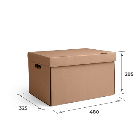 Гофрокороб архивный 480x325x295 с откидной крышкой изготовлен из прочного трехслойного гофрокартона марки Т-25 бурого цвета.