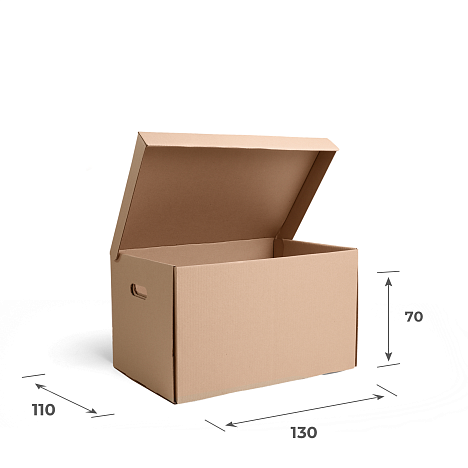 Гофрокороб 130х110х70 самосборный с откидной крышкой «Сундук». Собирается из одного листа по линиям рилёвки без использования скотча или клея. Две усиленные боковые стенки, которые образуются за счёт сложения клапанов. Клапаны имеют язычки, которые вкладываются в пазы дна.