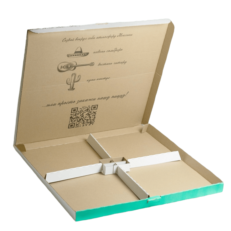 Что касается конструкции короба, то здесь мы использовали стандартную модель FEFCO 0426 с откидной крышкой. Самая популярная и надежная упаковка под пиццу. Она позволяет доставить конечный продукт в сохранности, а также сохранить все его полезные свойства.