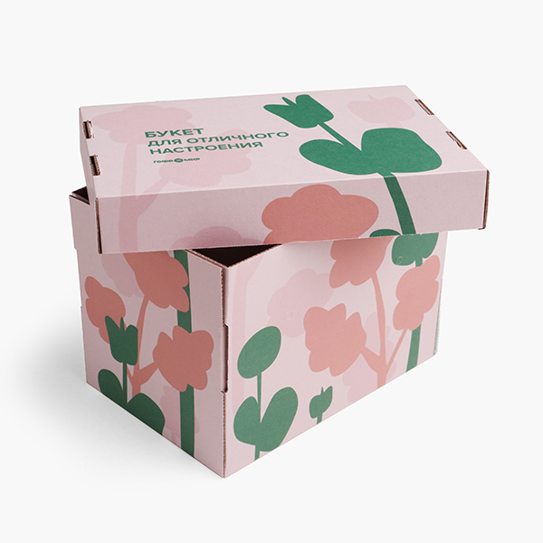 При разработке дизайна упаковки для букетов мы рекомендуем делать акцент стильных цветочных силуэтах и приятных надписях. Например, в данном случае мы добавили на крышку фразу «Букет для отличного настроения». Группа компаний Гофромир осуществляет полный цикл разработки упаковки, что включает в себя разработку или адаптацию дизайна и нанесение печати.