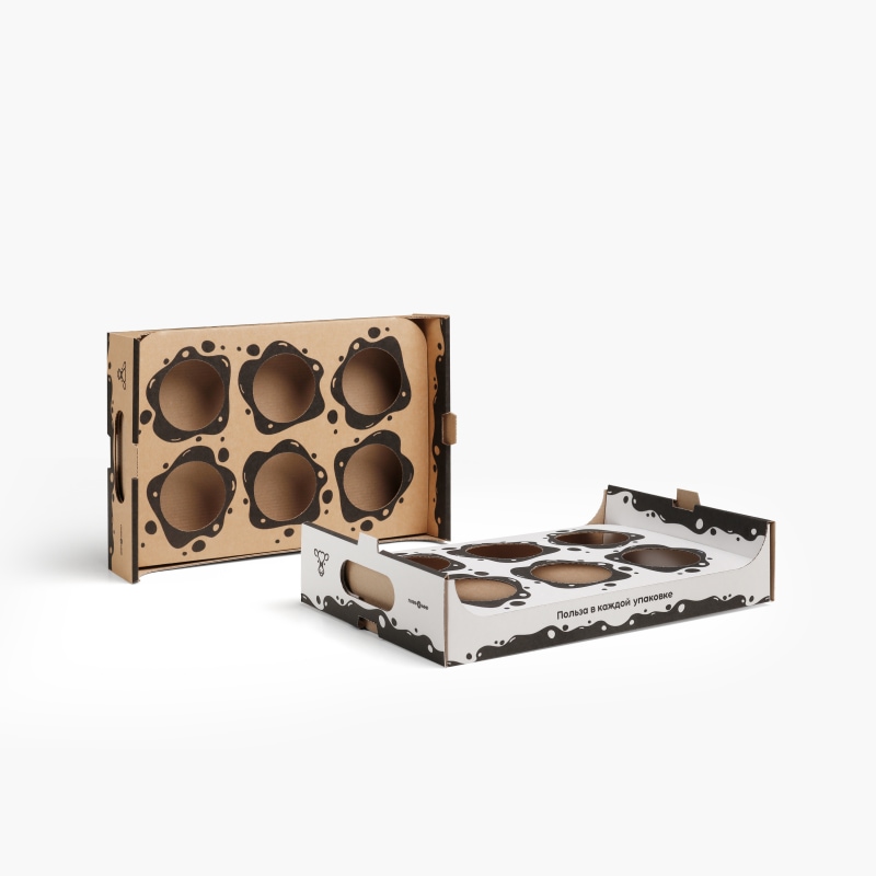 При оформлении коробки для лотка мы решили остановиться на монохромном стильном изображении с изображением коровы и узором, отсылающим к структуре молока. Ложементы также украшены изображениями. Группа компаний Гофромир осуществляет полный цикл разработки упаковки, что включает в себя разработку или адаптацию дизайна и нанесение печати.