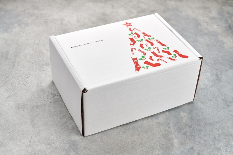 Дизайн мы нанесли при помощи флексопечати в три цвета на внешней стороне короба. Подобранные пантоны - зеленый, красный и черный.