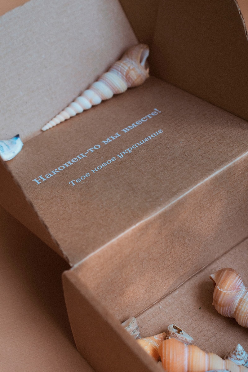 Оформление коробок мы решили сделать в стиле “минимализм”. Использовали лишь контактные данные компании, ее логотип и слоган. Все это мы нанесли при помощи флексографической печати в один цвет. Одобренный пантон - бриллиантово-белый. Выбран именно такой оттенок - ведь это так символично :)))