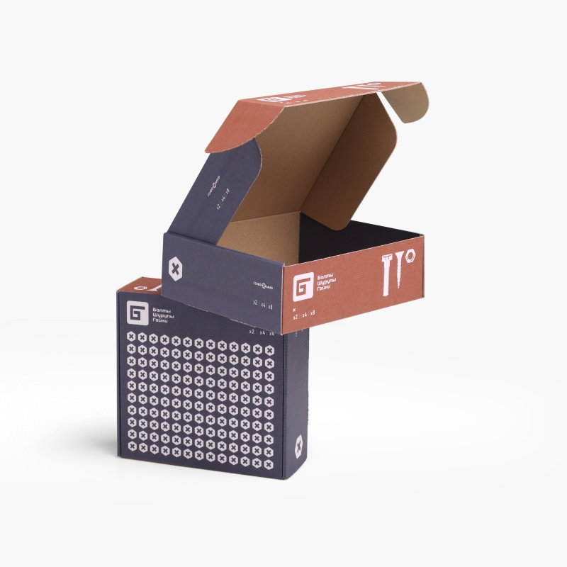 В дизайне коробок для крепежей мы ориентировались на заливку цветом и элементы, которые прочно ассоциируются с крепежами. Группа компаний Гофромир осуществляет полный цикл разработки упаковки, что включает в себя разработку или адаптацию дизайна и нанесение печати.