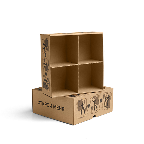 Мы выбрали монохромный вариант оформления для бурой коробки и разместили все игровые элементы на упаковке, стильно сочетая их между собой.