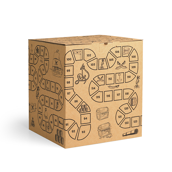 Двойная крышка с закрытым замком защищает элементы от выпадения из коробки. Кроме того, ее можно интересно стилизовать под элемент игры. Ячейки поля также можно представить в дизайне, разместив их на боковых гранях упаковки.